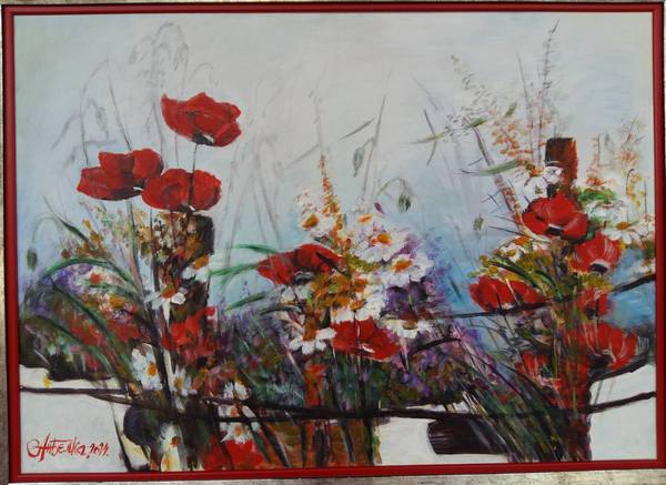 “Da me sad pitaš koliko sam slika u životu naslikala, ne bih znala da ti kažem. Poklonim svoje slike i svaka bude uramljena.” Rad Anđelke Ljumović, 2018.godine. Uslikano na izložbi u Tuzima
