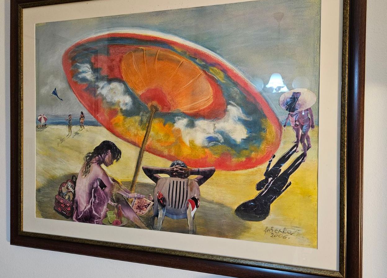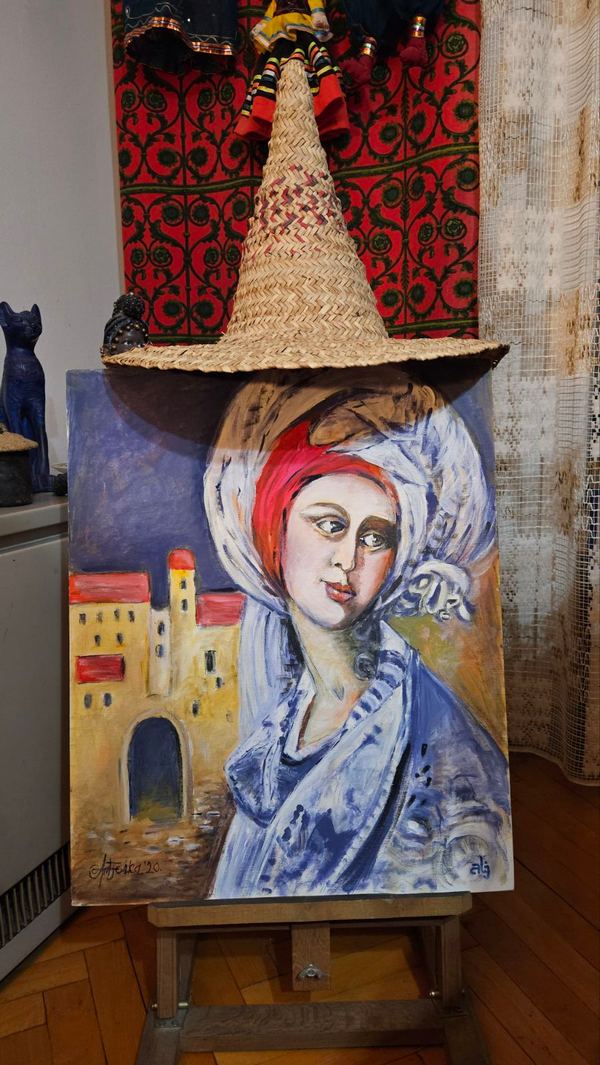 “Simonida” takođe zauzima posebno mjesto u dnevnoj sobi, rad Anđelke Ljumović. Sa šeširom donešenim sa putovanja.