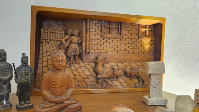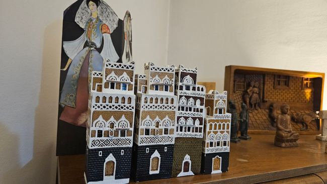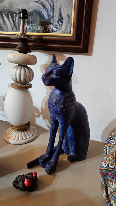 Suveniri iz Jemena. Neboderi su pravljeni od blata, a 1982.godine su uvršteni na UNESCO-ovu listu svjetske baštine. Iza njih je ideja za meni nekadašnjeg hotela Crna Gora, rad Anđelke LjumovićVitrina puna suvenira sa putovanja„Mačka je strašno teška. Kupila sam je ispred Gize. I na granici iz Egipta u Izrael sam htela da je bacim. Ipak je stigla do Podgorice.“