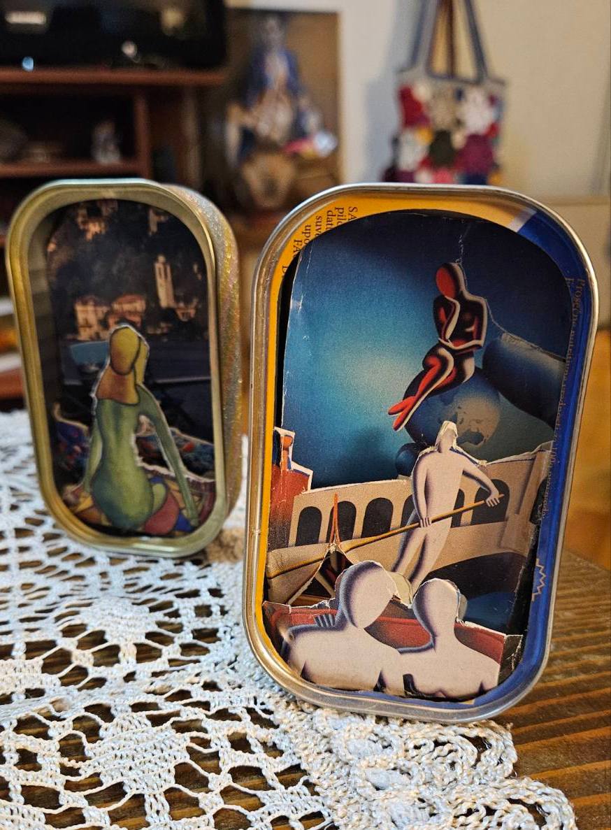 Detalj koji sam uslikala je sa najnovije Anđelkine slike koja se te večeri još uvijek sušila. „Nekad radim na slici kao da me neko tera. Mada, kad ne radim ništa, u devet sati mi se prispava. Ali šta onda da radim u četiri izjutra kad se probudim? I zato uveče stvaram: pletem torbe, kape, rukavice, mantile i dečije pape, slikam, rešavam ukrštenice.“Gospođa Anđelka svima plete, a ova torba je njen najnoviji rad. „Na vratima od sobe uvek visi poslednja napravljena kreacija.“.Poseban detalj u stanu čini ova slika i rekla bih da je omiljena u cijeloj porodici: „Jedan deo slike je slikan, a drugi je lepljen. Počela sam da je slikam u Baru, a onda se po njoj prosulo ulje za sunčanje. Na tom mestu sam naslikala senku i potom iz novina dodavala sličice. U Crnoj Gori nisam izlagala ovu sliku, a po Srbiji je bila na raznim izložbama.“Konzerva od ribe Anđelkinim rukama pretvorena u umjetnost. “Animirala sam i svoju komšinicu da pravi kolaže. I to joj je išlo vrlo lepo.“